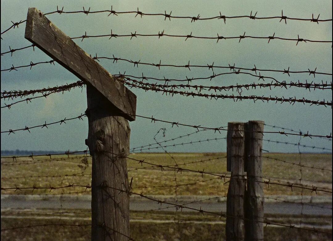 “血已枯干,口已缄然。”奥斯维辛集中营旧址前荒无人烟、杂草丛生。雷乃用缓慢的移动镜头记录着这里此时此刻不可思议的宁静,一排排整齐森严的纳粹建筑遗迹在晴朗的夏日里伫立。