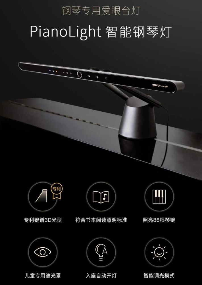 PianoLight智能钢琴灯,为立式钢琴量身打造。有别于普通照明灯具,明基PianoLight采用专利键谱3D光型设计,其经过设计的光路可均匀照亮琴谱,同时全面覆盖88个琴键,光线所及的每一个角落,均能够达到书本阅读的照度标准;也因其独到设计,不产生多余光线,避免在钢琴亮面留下眩光,也丝毫不会直射琴童双眼,再加上自动调光、入座侦测等智慧功能,突破专业钢琴照明盲点。官方指导价:1999元