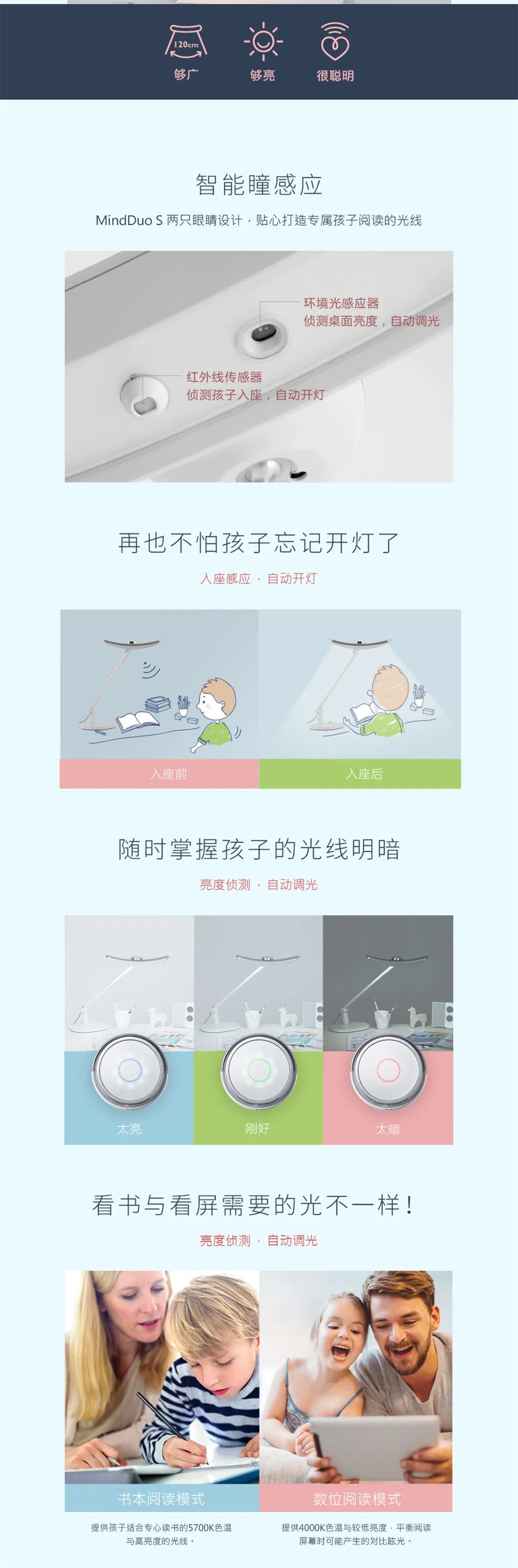 MindDuoS儿童智能阅读台灯,够广、够亮、够聪明。拥有120cm宽广照明,轻松照亮孩子整个学习桌面,同时满足家长与孩子一起阅读的需求;光源健康,更根据现今学习情境,设定电子阅读和纸质阅读双智能调光模式,自动调节给孩子适合的光线。