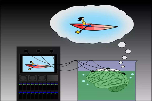一个人(也可以假定是自己)被一位疯子科学家实行了变态的手术,脑子被从身体中切除了下来,切下来的大脑被放到了盛有维持脑子存活的玻璃缸之中,脑的神经末梢和计算机连接在一起,计算机按照设定好的程序向大脑输送信息,使得他能够保持一切依旧正常的幻觉。