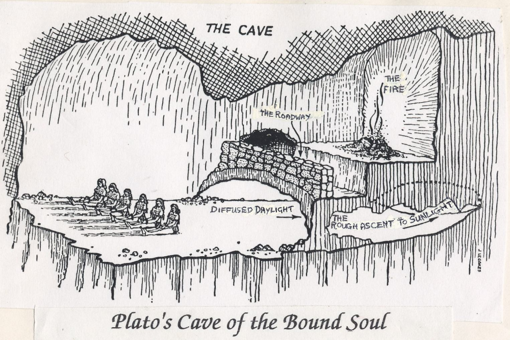 一群囚犯生活在洞穴中,手脚被捆住,无法转身,只能背对着洞口。他们前面是一堵墙,身后燃烧着一堆火,他们在墙上看到自己和事物的影子,认为这些影子是真实的。后来有人爬出了洞穴,才发现了真正真实的世界。