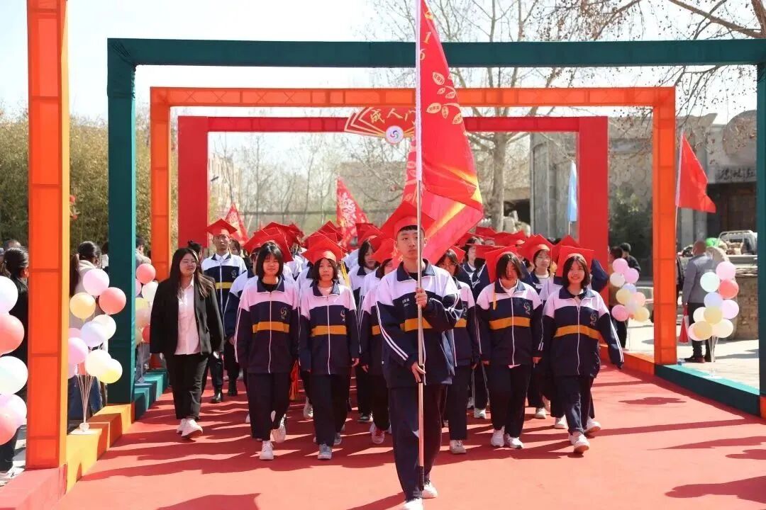 学生手握彩旗旗杆,如初春朝阳,百卉之萌动,利刃之新发,鹰隼试翼,风尘翕张,风华正茂,肆意而洒脱。