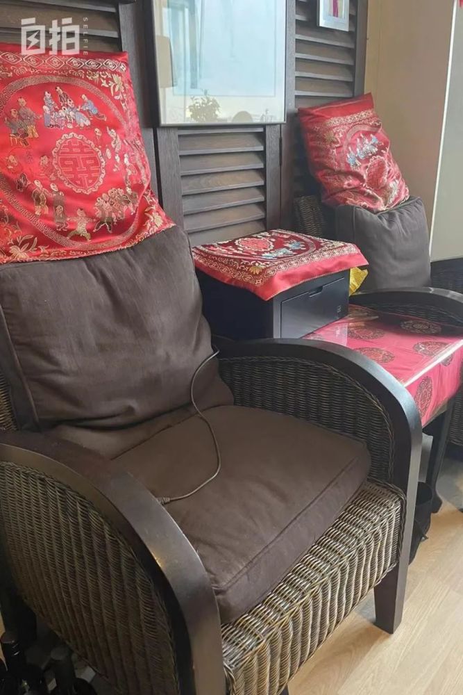 沙发垫、桌布都是我从国内给他带回来,他自己摆的。