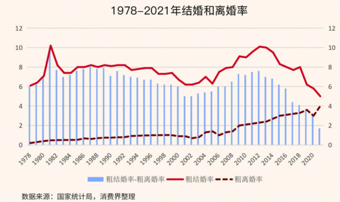 前段时间,我看到一个图表,上面标注了结婚率和离婚率的折线图。