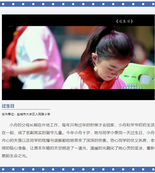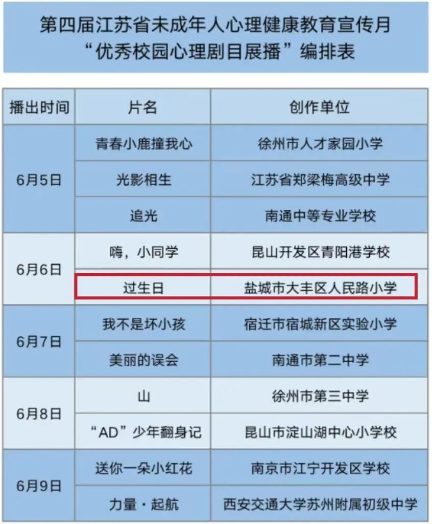 大丰区组织各中小学校积极开展关爱儿童心理健康“润心”行动。盐城市大丰区人民路小学的作品《过生日》入选第四届江苏省未成年人心理健康教育宣传月“优秀校园心理剧目”。组织广大师生观看《江苏教育频道》“六一”特别策划节目《带你走进心理光影世界》优秀心理电影导读、中小学校园心理剧优秀剧目以及相关动画片、儿童剧、短视频,组织学生撰写观后感,引导学生培育健康、积极、向上的乐观心态。