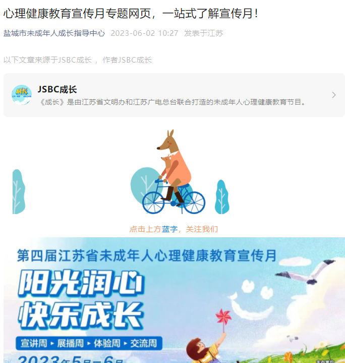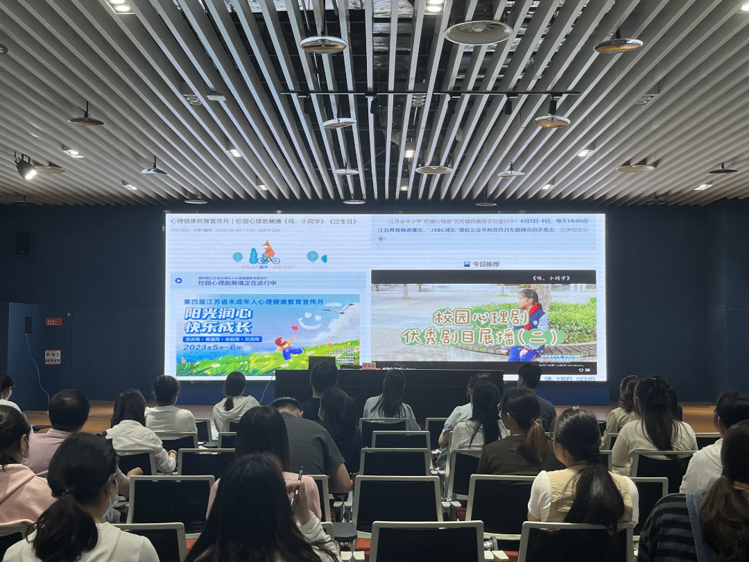 盐城市未成年人成长指导中心在盐城市第一小学组织学生观看心理健康教育视频《远离不良情绪,守护平安人生》,在盐城市康居路初级中学展播《青春期的家庭教育与心理健康》心理健康教育视频,通过公众号展示心理健康宣传月专题网页,推送《成长》栏目校园心理剧和心理短片,引导学生养成热爱生活、积极乐观的成长心态。