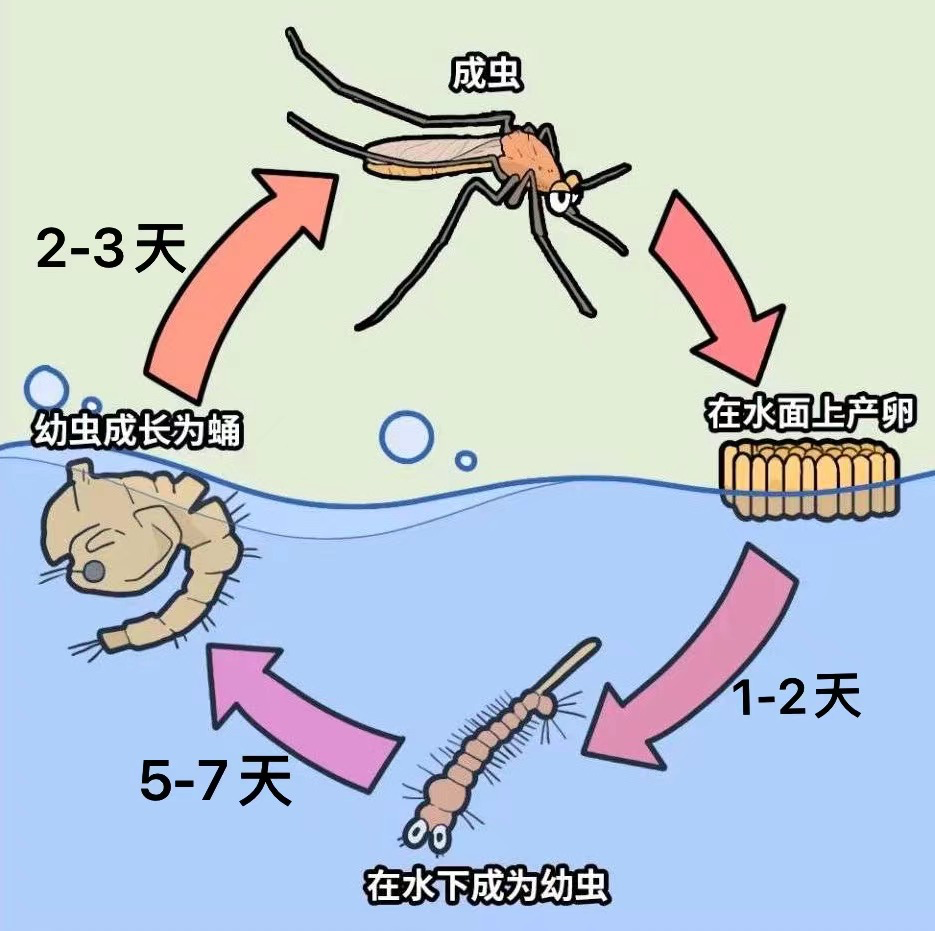 蚊的发育为完全变态,生活史分四个时期,即卵、幼虫、蛹和成虫。在适宜的环境里,雌蚊将卵产在水中,1~2天后就孵化成幼虫,叫孑孓(jié jué)(是不是又多认识了两个字,哈哈哈)。