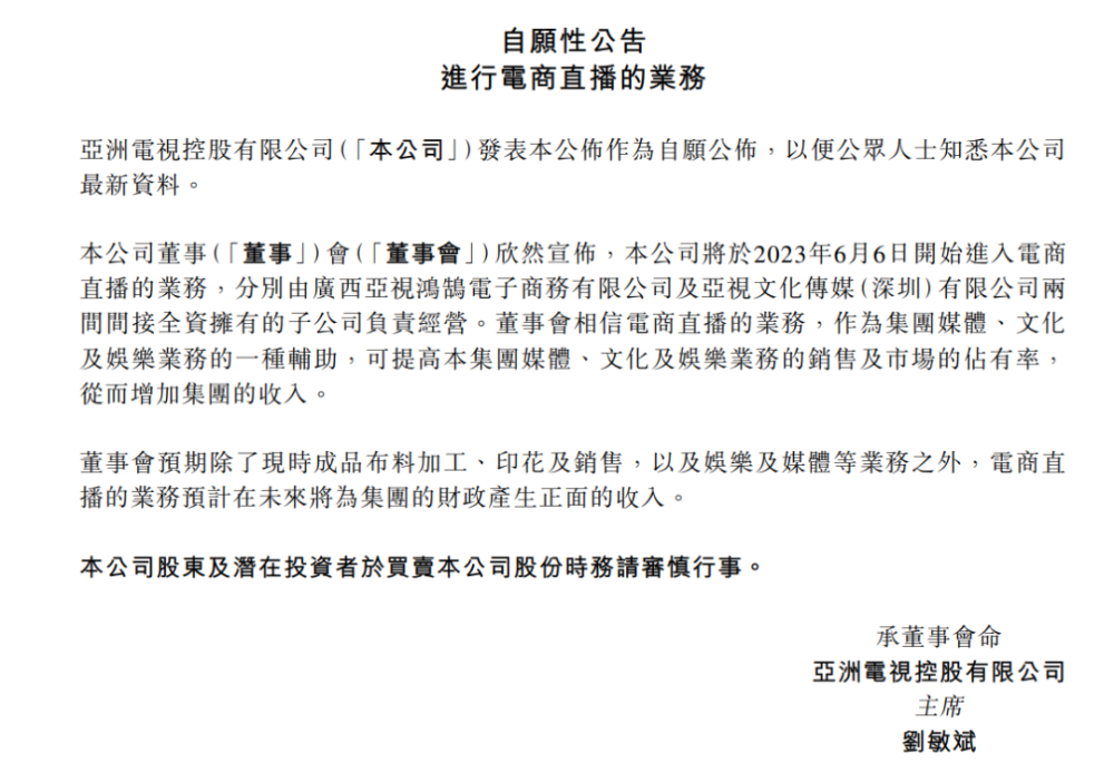 新榜讯 6月6日,亚洲电视控股有限公司发布公告称,公司将开启电商直播业务,分别由广西亚视鸿鹄电子商务有限公司及亚视文化传媒(深圳)有限公司两间间接全资拥有的子公司负责经营。董事会相信电商直播的业务,作为集团媒体、文化及娱乐业务的一种辅助,可提高集团媒体、文化及娱乐业务的销售及市场的占有率,从而增加集团的收入。