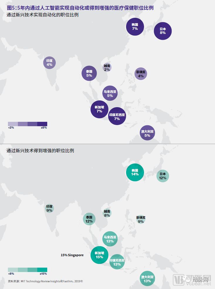 虽然该行业的工作机会将减少,从日本的约8%到菲律宾的约5%不等,但更大的影响在于,随着新兴技术的出现,这些工作将得到增强和改善。研究表明,在新加坡和韩国等市场,大约14%的医疗保健工作将因为人工智能而变得更加高效和更具生产力。