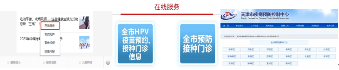 可关注“天津疾控”微信公众号,点击“在线服务”—“全市接种门诊”查询附近接种门诊地址及电话,预约后前往接种。