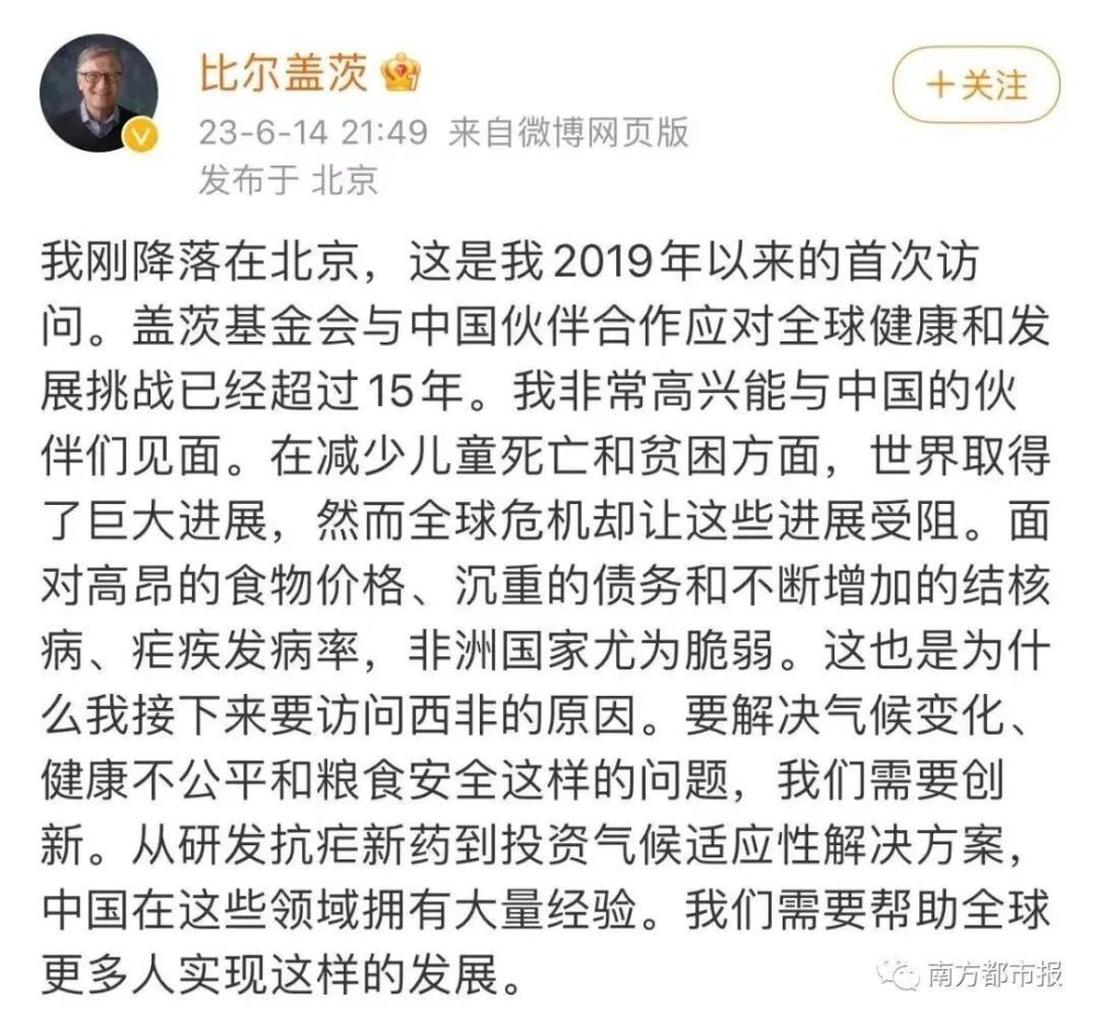 比尔·盖茨近4年来首访北京,宣布捐5000万美元