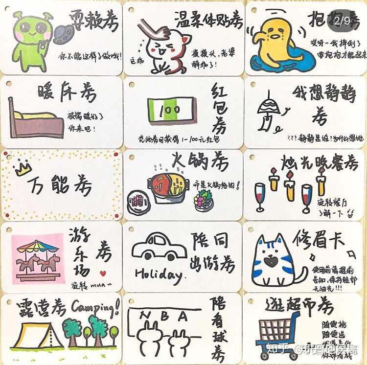 ⑦自制情侣券这个也很有创意!!!因为男朋友强烈要求我少花钱不用给他买礼物,所以我大部分的东西还是DIY自己制作的比较多,这个情侣券就是提升情侣亲密度的啊哈哈哈哈哈,如果他一次考试考到了目标分数就可以给他一张券,比如什么亲亲券啊抱抱券啊马上不生气券啊之类的(图片也是来自知乎某小姐姐的)