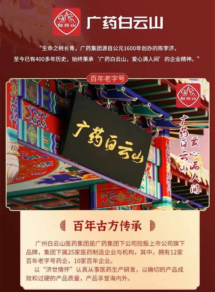 广药白云山出品品牌实力硬核,极有保障广药白云山,是中国目前知名的医药工业企业。连续7年蝉联中国制药工业百强第一名。旗下有12家百年中华老字号,10家百年企业。