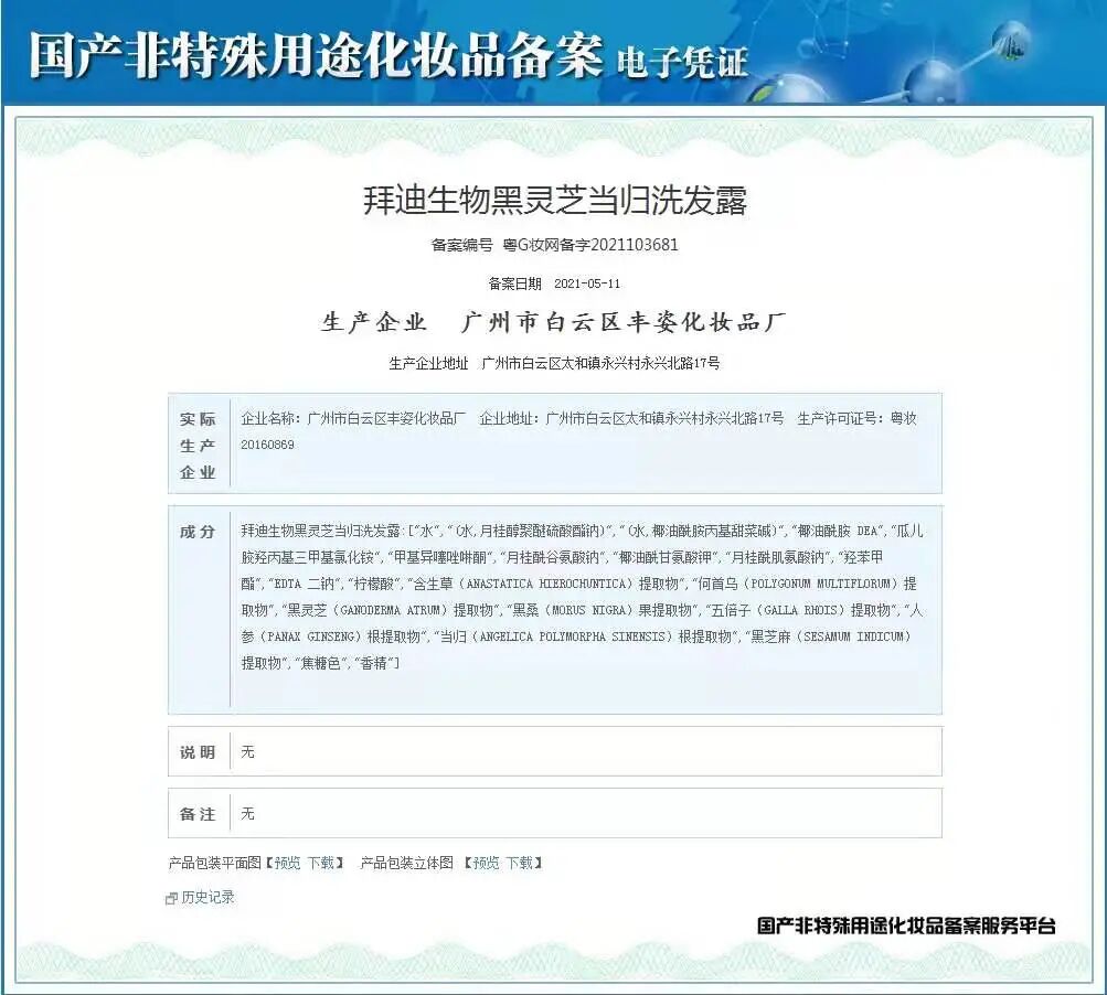 这款黑灵芝洗发水由白云山旗下拜迪生物专研。每一瓶都严格把控品质,通过国家层层质检,证书、资质一应俱全。