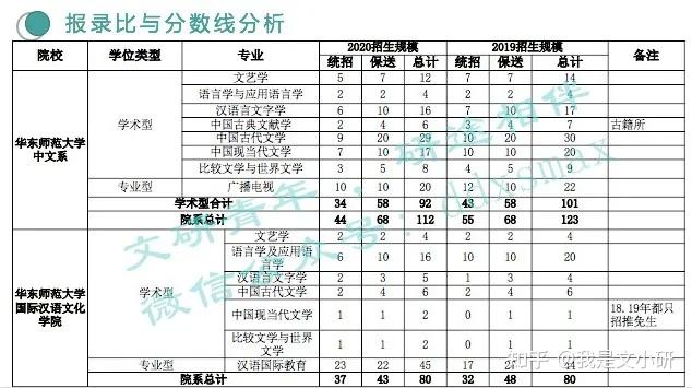 从录取人数上也可以看出来。基本上统招的人数华东师大都会在录取简章上作比较具体的说明。其中广播电视录取人数比较多,是一个19年新设的专硕专业。其次是现当代文学和古代文学,也招收人数较多。其他专业比较少。大家如果对某个特定的专业感兴趣,一定要事先了解情况。国际汉语文化学院的专业中,语言学及应用语言学招生较多,但比较文学、现当代都极少,18年、19年都只收推免生。务必要看清简章。