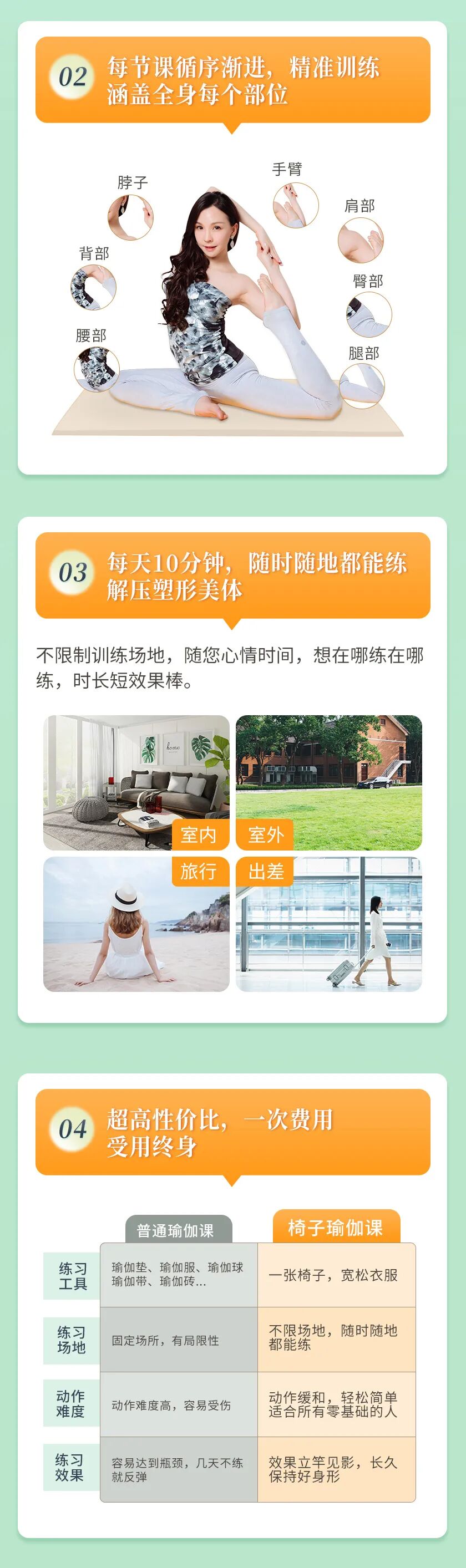 不甘心就此胖下去,于是她远去美国进修运动管理专业,希望找到省时又高效的速瘦变美方法。每天除了上课,她会查找很多资料,不是泡图书馆,就是在请教老师的路上。她结合传统瑜伽动作,浓缩精选,专挑对身体精准发力的动作,自创出一款新型瑜伽。无需任何器具,在椅子上完成所有动作,简单方便,不占地方不用跑不用跳,简单扭转、挤压、拉伸,提高代谢,狂甩脂肪由内燃脂到由外塑形,轻松触达背颈腰腹臀腿,让人不知不觉变瘦变美由内而外,驱动身体发力,外塑形体,内活气血,多管其下:全身肌肉唤醒:深层激活肌肉群,从头到脚活化气血和机能,让身体快速激活、四肢更加灵活;