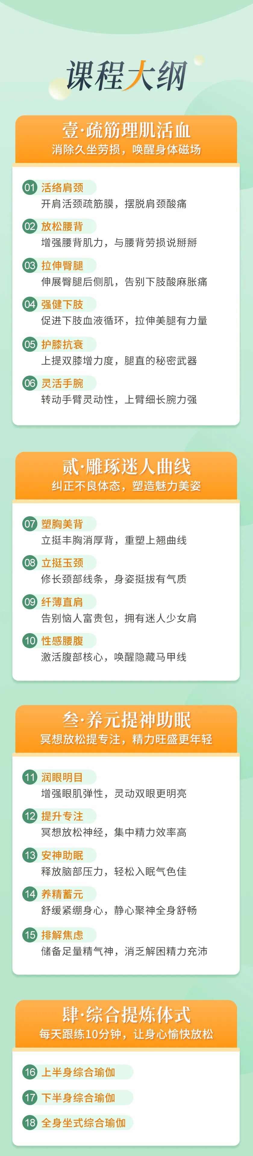 从瘦身、塑形、气质、提神各方面助你由内而外焕发冻龄曼妙身姿轻松拥有变成吃不胖体质实现自律、健康的运动作息本课程分为三大板块:疏筋理肌活血、雕琢迷人曲线、养元提神助眠