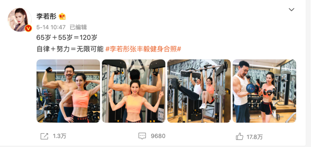 前阵子还晒出了和张丰毅一起在健身房锻炼的照片,并配文“65+55岁=120岁。自律+努力=无限可能。”看到她手臂上的肌肉和马甲线,网友还调侃李若彤:现在都可以一巴掌能拍死段誉了。