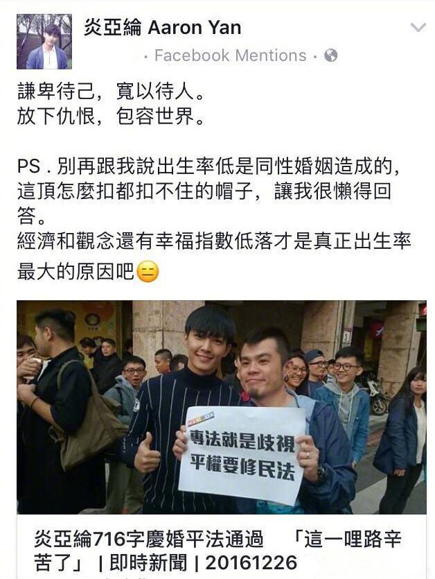 早些年前,炎亚纶也一直公开宣扬同性不该遭受歧视,他也曾被目击出席同志活动。
