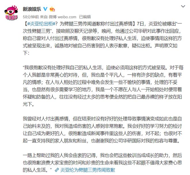就在刚刚,炎亚纶通过个人社交平台发声道歉。