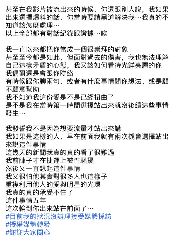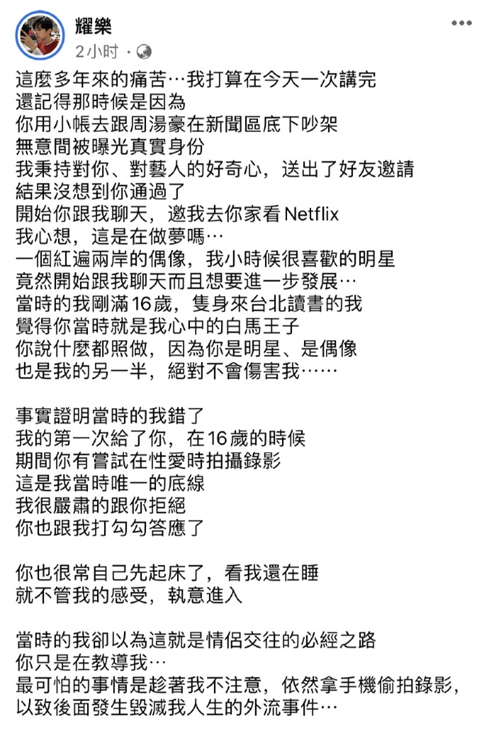 最后,邱耀乐也强调自己并非因为流量才站出来爆料,只是因为前段时间刚遭遇性骚扰,加上这两天的新闻影响才没能承受住说出口。