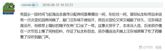 后来,组合成员辰亦儒也在节目中爆料过此事,只不过他表示汪东城只是吃了感冒药睡着了,至于炎亚纶为什么蹲在门口坐一夜,辰亦儒则没有正面回应。
