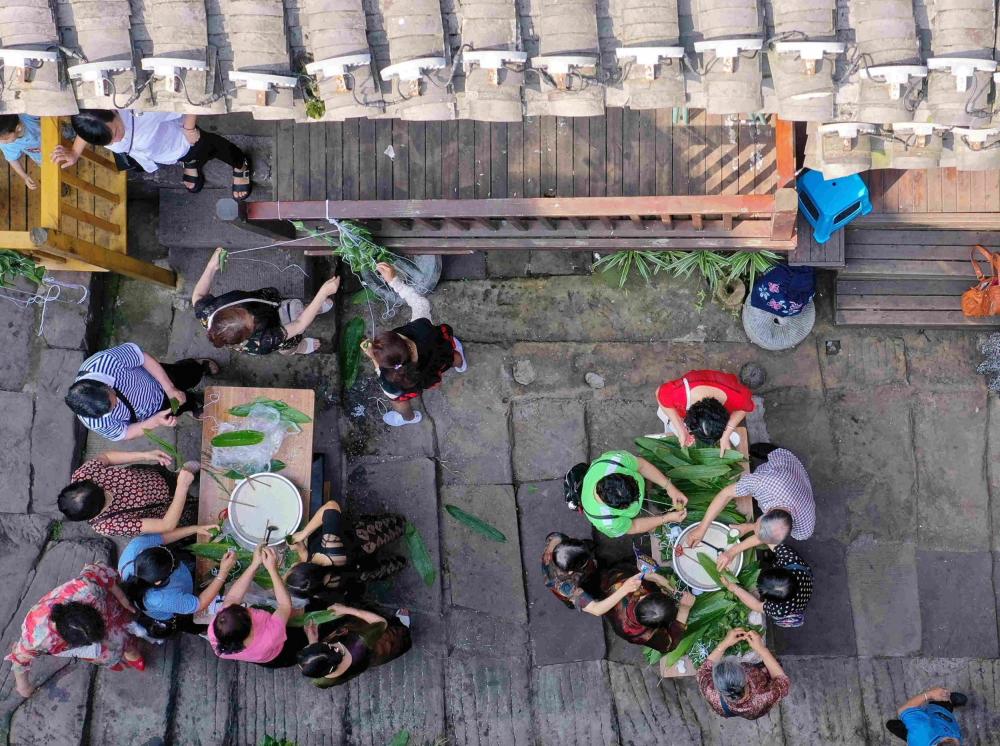 贵州赤水市市中街道滨江社区居民参加包粽子比赛(无人机照片)。苟炼炜 摄
