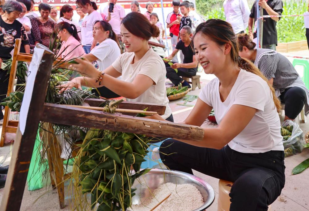 在贵州遵义市新蒲新区新舟镇群乐村举行的“粽香迎端午,增进邻里情”活动中,村民参加包粽子比赛。简垦 摄