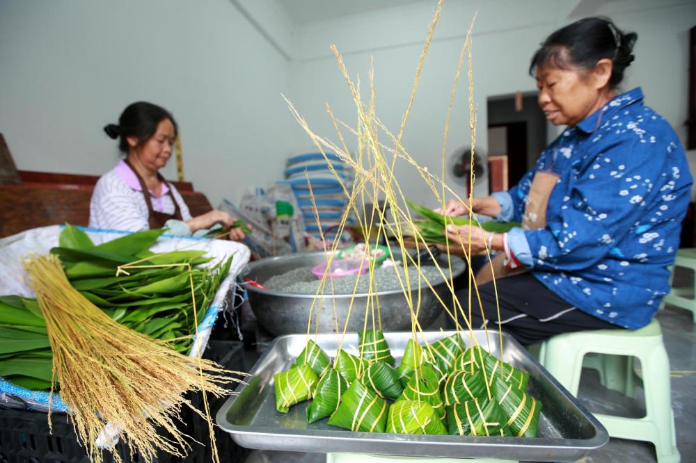 在贵州册亨县举行的“盛夏赋雅趣,锦绣满粽香”端午节活动中,居民在包粽子。刘朝富 摄
