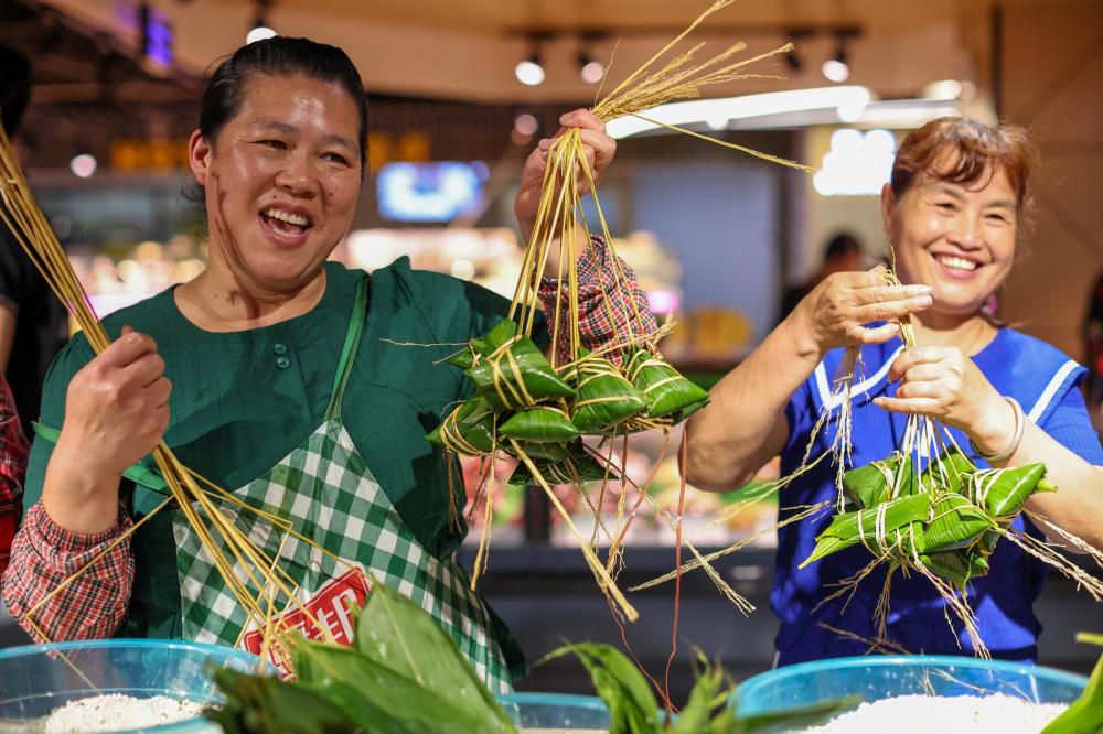 在贵州丹寨县一家超市,参加包粽子比赛的顾客展示包好的粽子。杨胜贤 摄