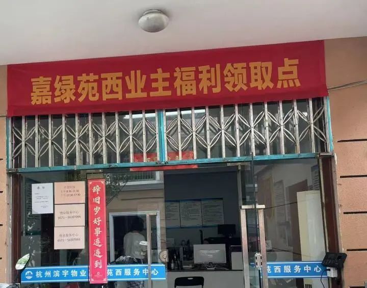 嘉绿西苑小区物业服务中心大门上拉了一条红色横幅,醒目地写着:业主福利领取点。