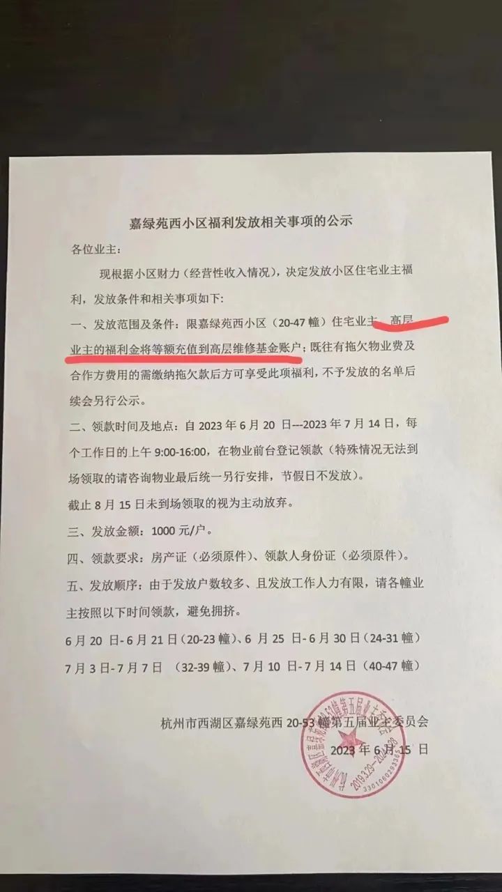 他在杭州城西嘉绿西苑住了20多年,头一回遇上业委会给业主发红包,“每户发一千元现金,还免掉今年一年的物业费”。