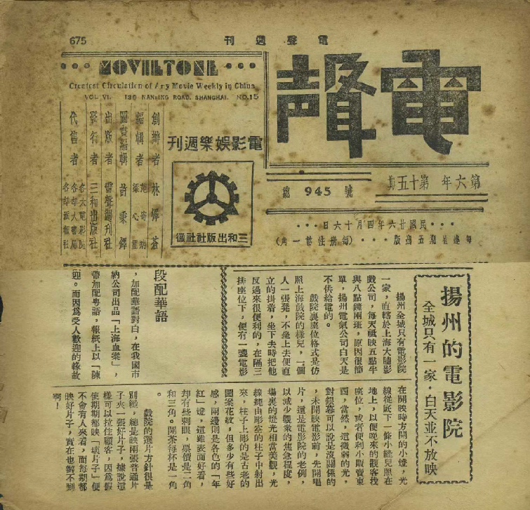 史料展还展出了一张 1937年4月16日的《电声》报纸,其中记录了扬州电影院当时的经营状况。同时,民国唯一的扬州电影院——南京大戏院照片实物也首次亮相,由南京大戏院当年的员工王炳坤的儿子王立提供。该戏院每天只有在下午五点半、晚上八点两个时间段放映电影。“原因很简单,扬州电气公司白天是不供给电的。”报道中记载。