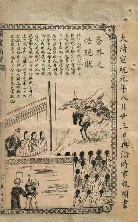 1909年8月,扬州百姓遇上了一件稀奇事:镇江一家影戏公司在扬州埂子街放映电影,一时间引得百姓纷纷前往观看。而此事被巡官得知,骑马前往驱逐,最终放映队被逐回。而这一事件被当年的《舆论时事报》以整版漫画的形式刊登了出来。