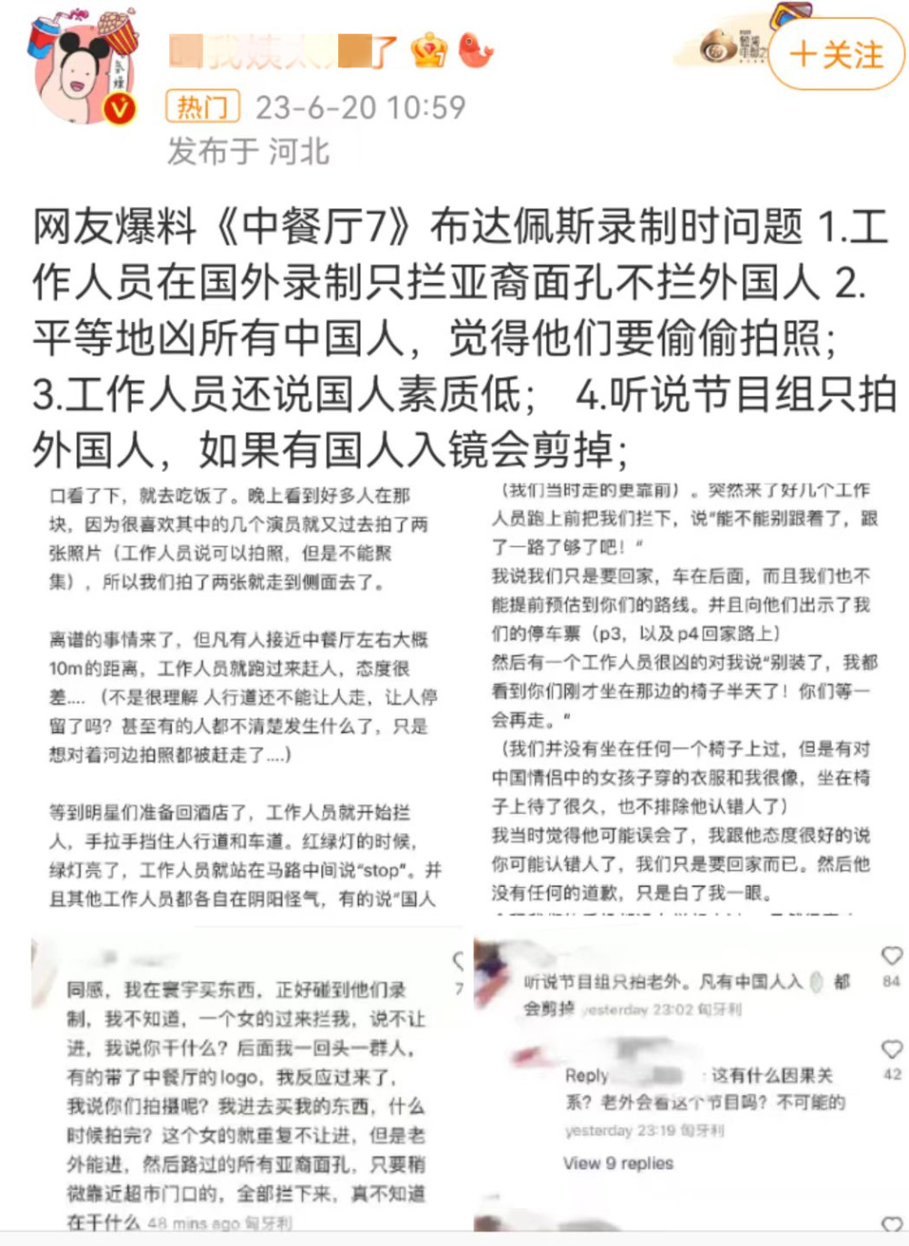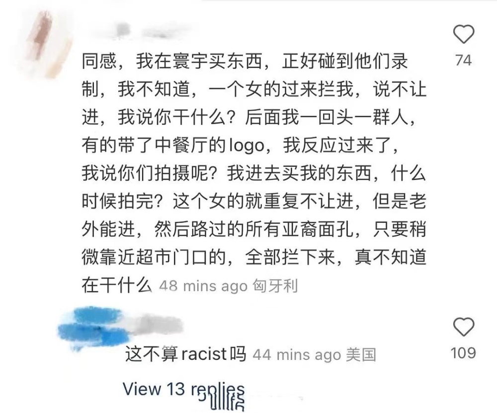 随后就有当地的其他路人站出来附和,表示自己在当地超市买东西,遇见了《中餐厅》的录制,在自己不知道的情况下,他们就在门口拦着不让自己进去。并且只要是亚裔面孔都统统被拦下,而当地老外是可以随意进出的,这种区别对待也让一些人感到不满。