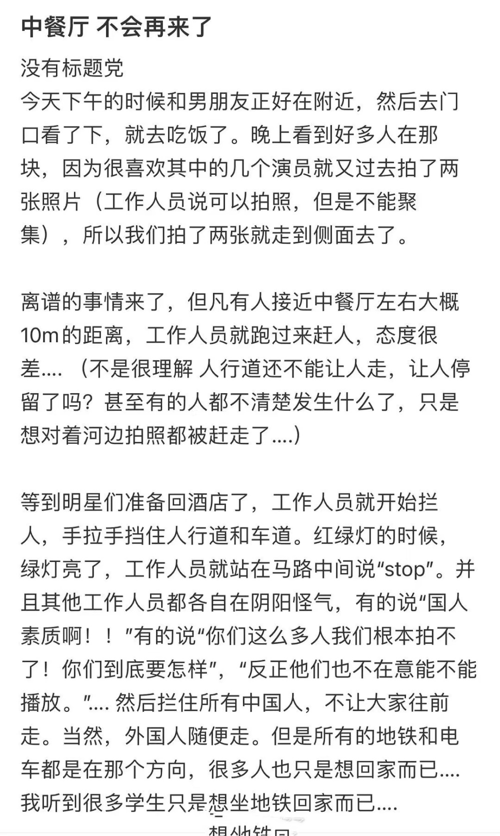 结果在录制期间,就有在当地的路人表示“中餐厅不会再来了”,她表示当时跟男朋友在附近,就去门口转了转,晚上过去时就有好多人在那边站着。而全文的重点则是在吐槽工作人员过度的拦截,隔了很远就被工作人员赶走,并且还阴阳怪气吐槽国人没什么素质。