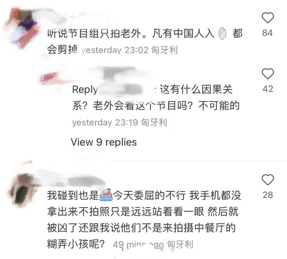 然后有不少IP地址就在匈牙利的网友纷纷吐槽,表示自己就远远看一眼就被人凶了一顿,还有人表示节目组只拍老外,凡是有中国人镜头的都会被剪掉。这样的行为不得不让人觉得是有些区别对待,虽然节目是在国外录制,但从往季来看,来捧场的还是以国人居多,而且节目受众本身就是国人,得罪国人不是个太明智的举动。