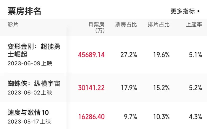 2023年亦是如此,共有9部外片定档6月。其中,《变形金刚7》《蜘蛛侠:纵横宇宙》《速度与激情10》《天空之城》等多部外片,暂居6月单片票房排行榜TOP10。