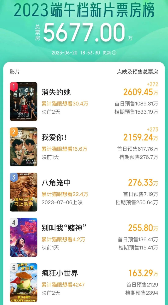 2023年端午档进入倒计时,《消失的她》《我爱你!》赢在起跑线上。目前,两片点映及预售总票房均超越2000万票房,成为档期票冠种子选手。