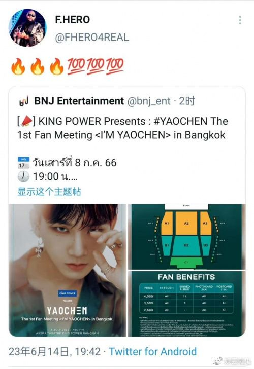 值得一提的是,曾凭借《Good Night》获得了第七届 Kom Chad Luek的“最佳音乐”奖的泰国知名Hip-Hop男歌手F.HERO(Natthawut Srimok),也为好友姚琛转发了泰国粉丝见面会相关推文,以表支持。