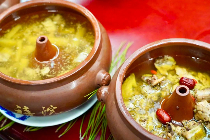 采用建水土陶制作的汽锅被汪曾祺誉为“最佳”,蒸制全程不加一滴水,仅靠蒸汽汇成了这一锅精华,最大程度地锁住了食材的味道,揭开盖子的一瞬,“汤清如水,鸡香扑鼻”,入口甘甜鲜香、余味悠长,实在很值得细细品尝。
