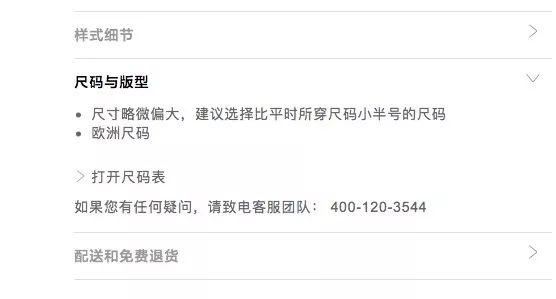 来自意大利佛罗伦萨的LUISAVIAROMA将女装、男装以及童装同平台通过细节图和动图展示。客服虽比不上较早深入国内消费群体、本地化已经日趋健全的网站——微信服务号是唯一可以进行中文沟通的渠道。可能因为中文客服团队尚未完善,所以回复比较慢,表妹等“首单是否有优惠”的回复一不小心就从周二等到了周五。最快捷的方法应该就是打电话客服了,拨通后按“2”号键选择英文客服。我们在网站上没有查找到首单优惠和邮寄时间的信息,为了确认真实情况拨通了LUISAVIAROMA的客服电话,也得到了耐心解答。