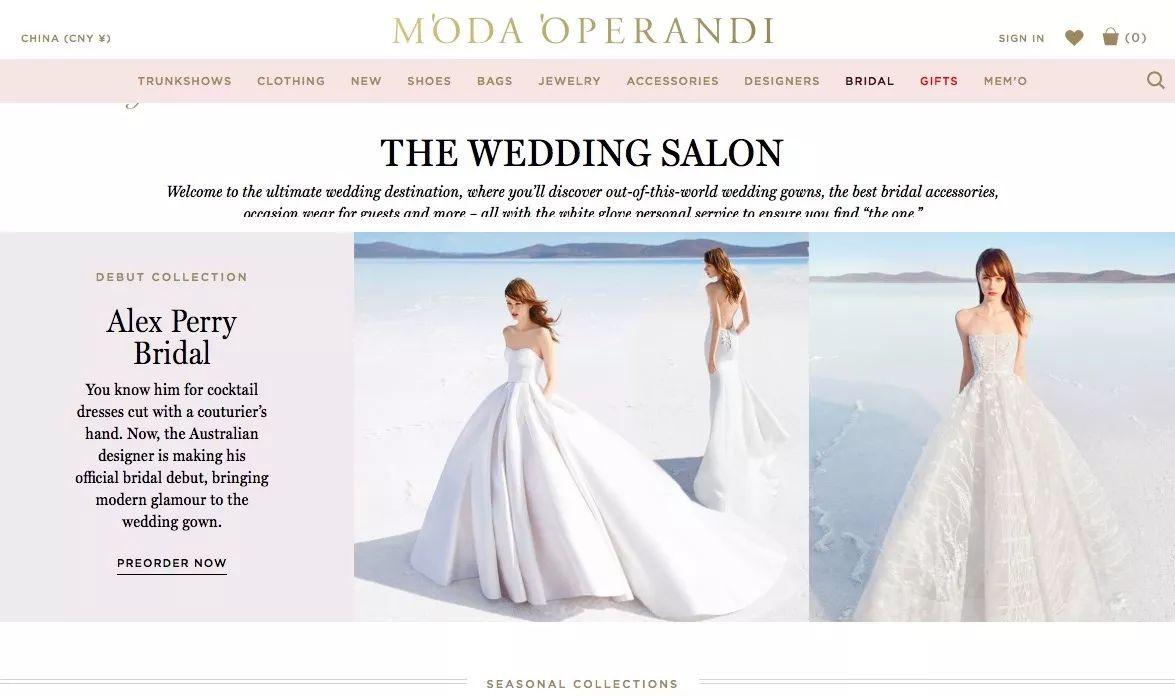 婚纱系列是MODA OPERANDI的一大特色,价格有千元档也有万元档,囊括了婚纱、配饰、婚礼鞋履等整套搭配,连婚礼宾客的着装都考虑到了。不仅有预售款,还有不需要熬漫长预售期的经典款式,更可以根据婚礼场合选则。