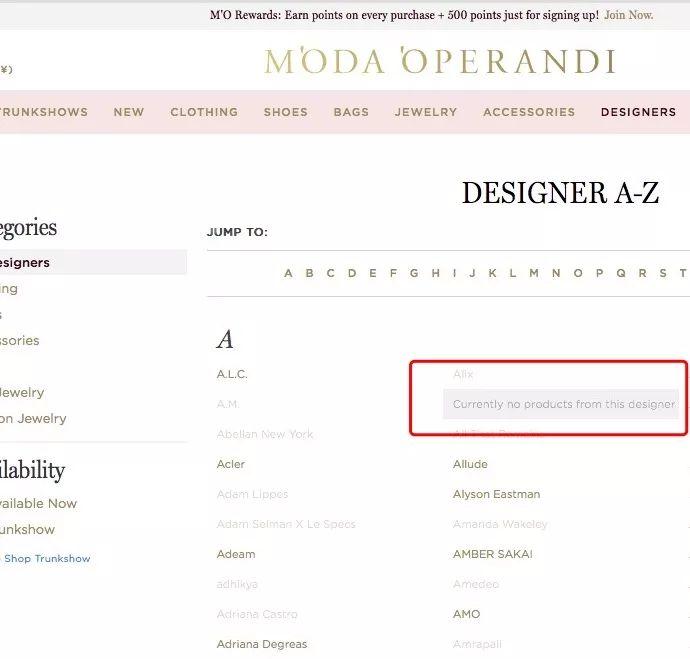 MODA OPERANDI可以用亚马逊账户直接登录,而在网站入驻设计师品牌的索引中也是少有的实诚:会主动标示暂时没有商品售卖的品牌,避免了用户点进品牌页面却空空如也的情况。