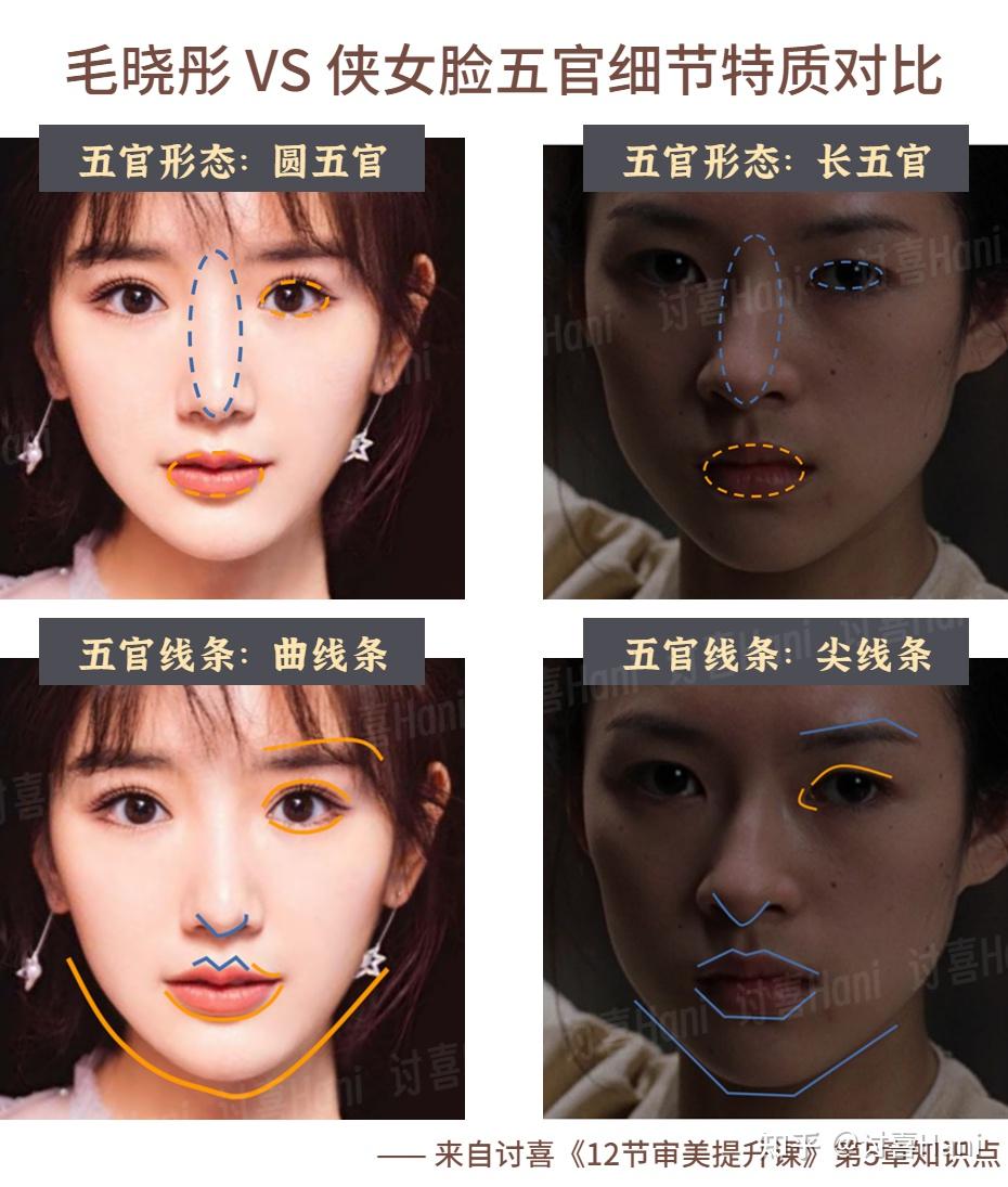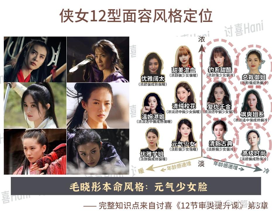 侠女的凌厉、利落和肃杀之气,对照《12节审美提升课》里的12型面容风格是冷系脸的6种,而毛晓彤属于元气少女脸。