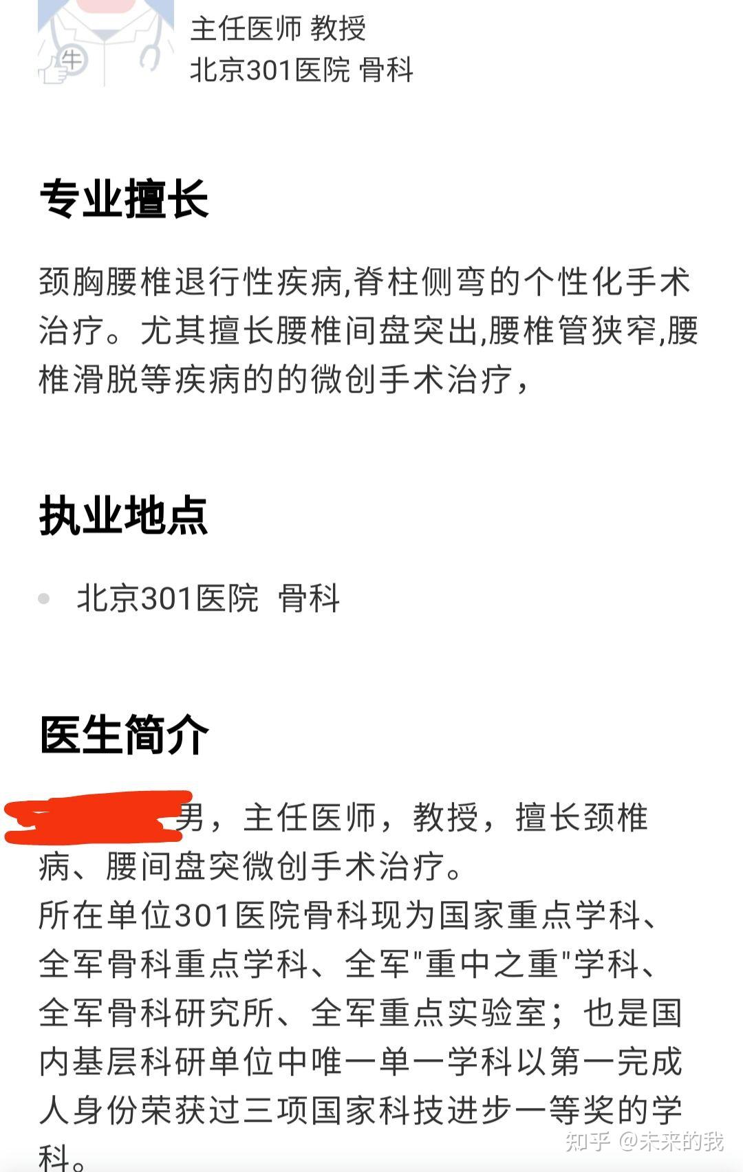 这时已经快到第二年的春节了,腊月二十七,我去了北京,301~~~~医院,301~~~医院骨科的水平在全国应该是最一流的,我挂了一个很著名的专家号,去之前又在地级三甲医院重新照的片子。据说这个专家的水平在国内都属于顶级的。按我的设想这已经就是大神一级的存在了,我不要求去一次就能给我治好。我就是想明明心,问问专家,我的病到底应该怎么治…!!!截图是专家的简介。