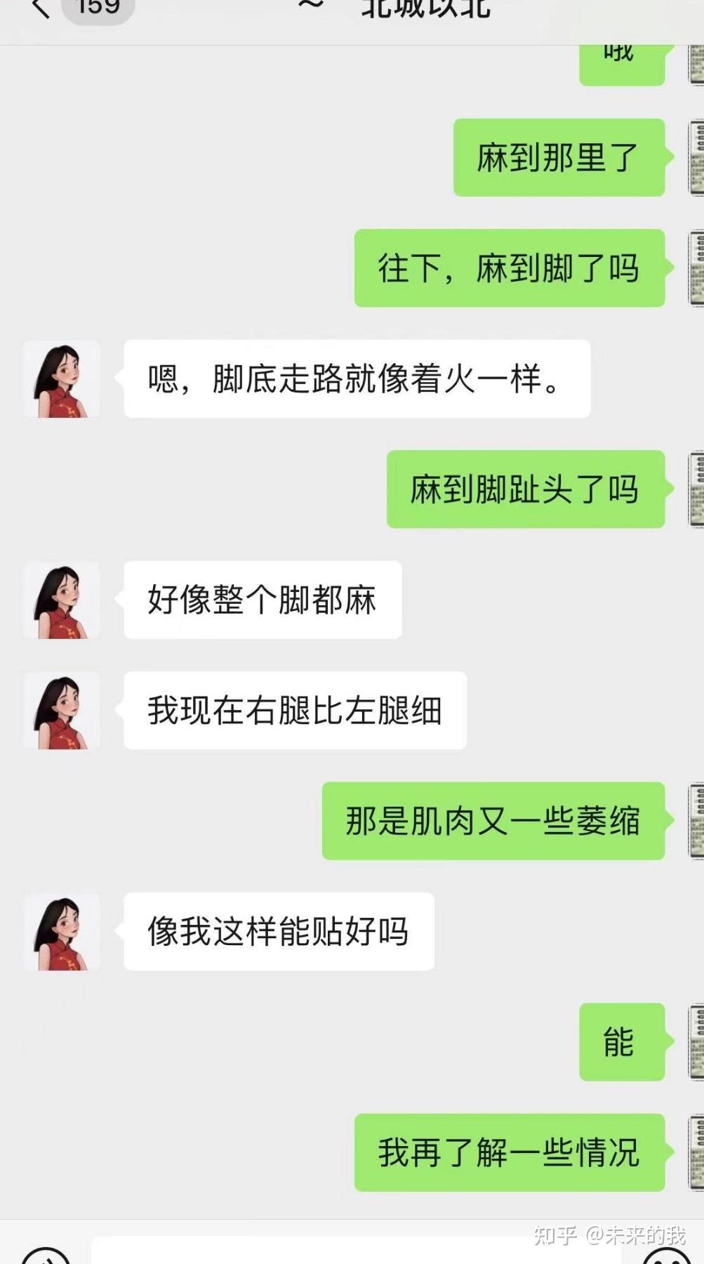 联系到我时,整个脚都是麻的,明显的一条腿粗,一条腿细,这都是由于得病时间长了,已经有了明显的肌肉萎缩,但是当她去当地的医院治疗,大夫却总是让她回家卧床修养,躺着,根本就不用心去考虑她的具体情况