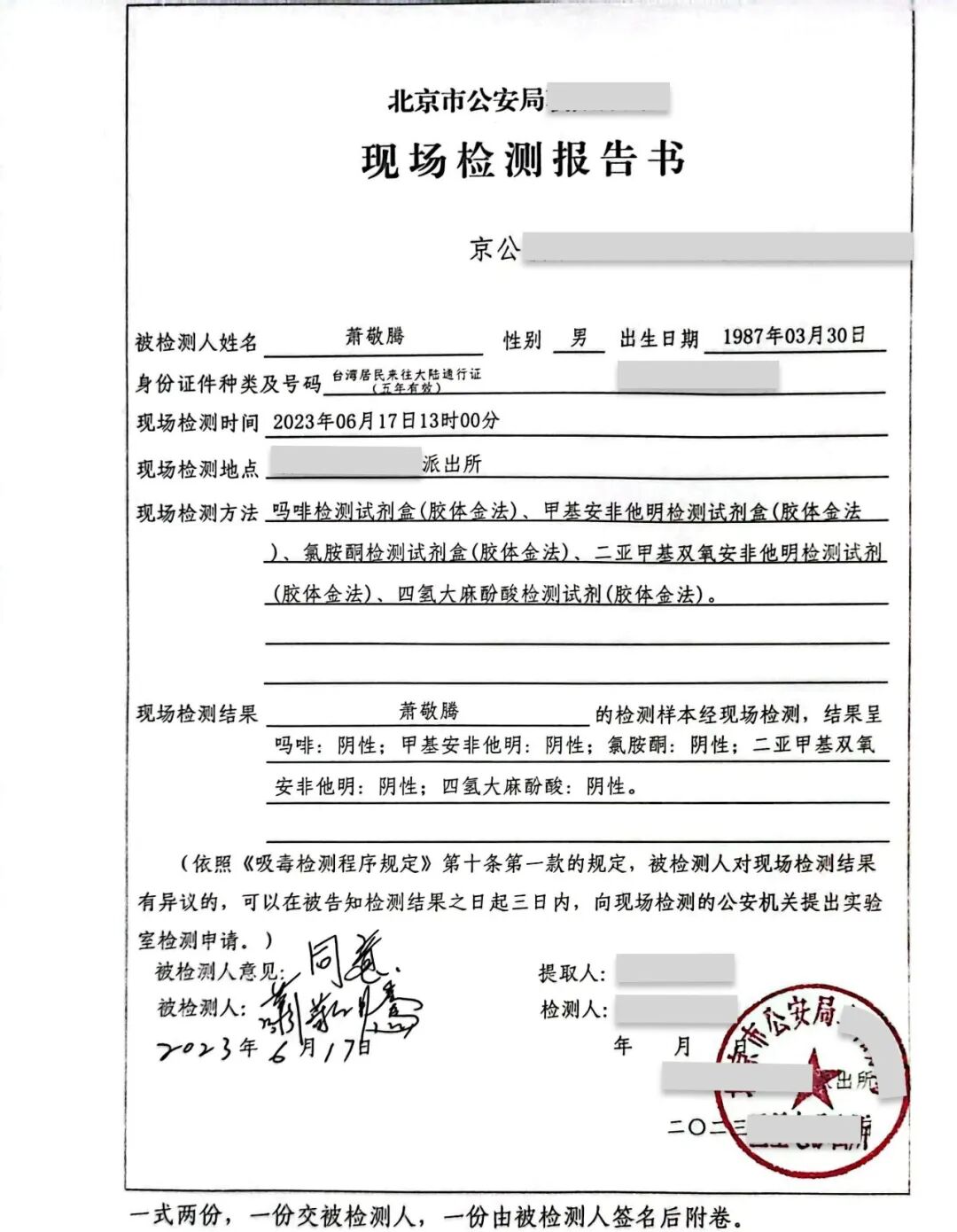 近日,网传萧敬腾走红毯时的状态疑似吸毒。6月17日,萧敬腾工作室发出毛发检测报告证明未吸毒,表示已报警处理,并在警方要求下进行毒检,结果显示为阴性。