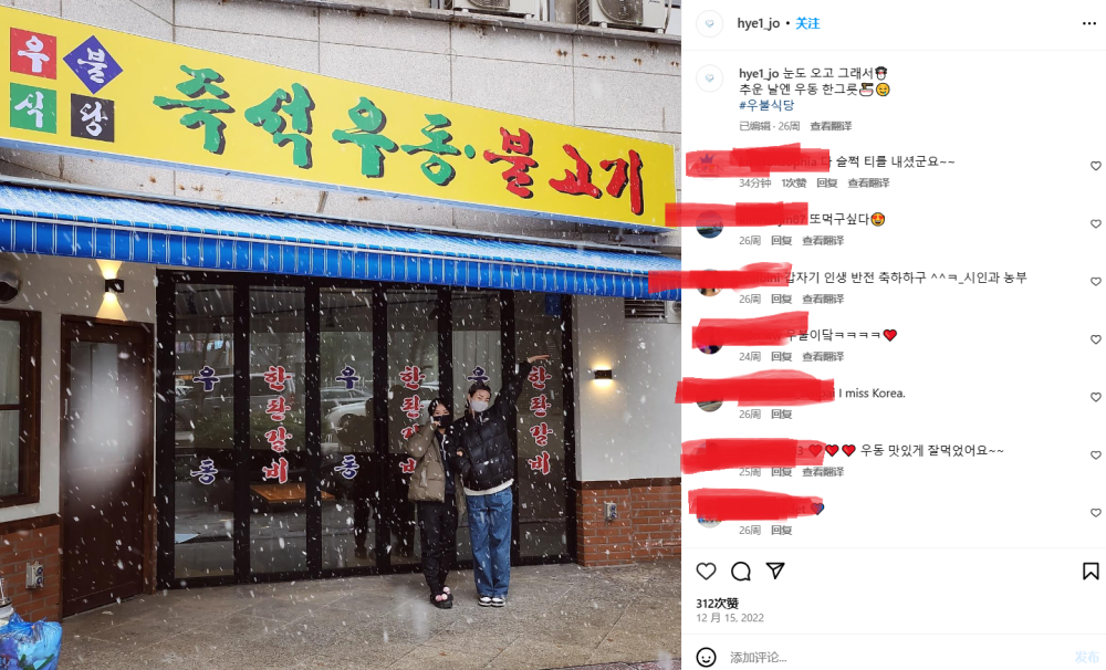 李章宇认爱赵惠元的消息一出,立即引起韩网热议,在大量网友纷纷送上了祝福之际,也有细心的网友的发现。早在去年12月,赵惠元就已经趁着下雪浪漫地在李章宇经营的面店前与好友合影留念,默默地完成了爱的打卡~