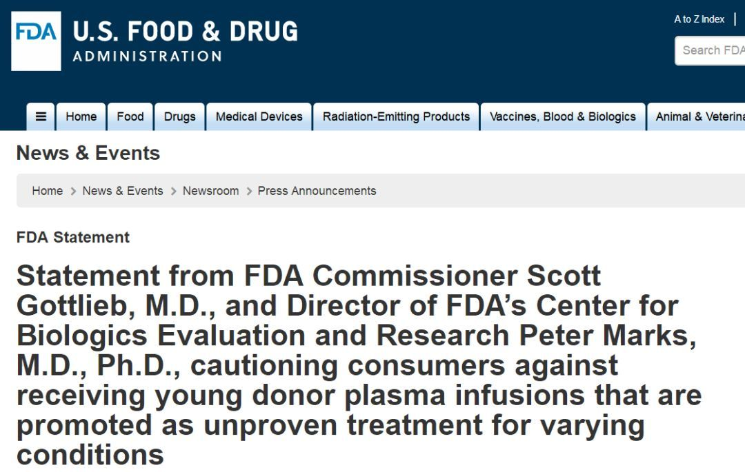 到2019年2月,FDA终于对甚嚣尘上的商业化换血行为作出反应:“强烈建议消费者不要购买‘年轻血液’的产品,因为这种产品的疗效与副作用尚不为人知。”